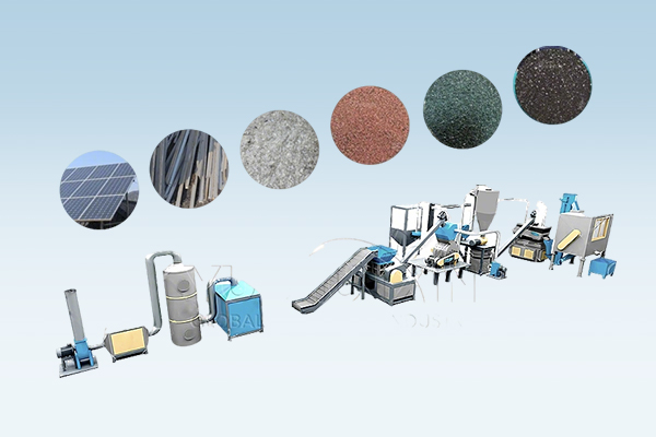 The largest share of total investment is the recycling line itself. A complete 500kg/h plant typically includes frame removal equipment, glass removal machines, crushing systems, screening units, airflow separation devices, dust collection systems, and electrical control cabinets.
